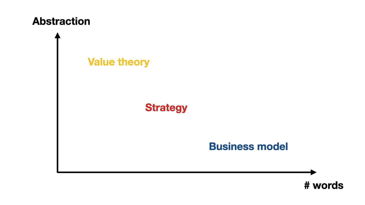 First, as we move from theory to business model, we increase in detail but decrease in abstraction. A value theory might be expressed in a few powerful sentences. A strategy can be condensed to half a page to a page. While a business model might require pages of documentation to fully describe.