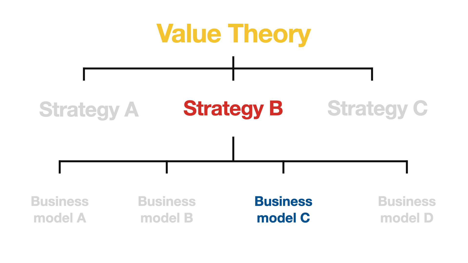 But this hierarchy isn't just an academic exercise. It can have a strong practical relevance through determining where you should focus when things aren't working as planned. If a firm struggle, is the problem it's business model, it's strategy or the value theory itself? Without a conceptual understanding of these levels, it's easier to reject a good idea on the wrong grounds. For example to reject a value theory or strategy, when it really was the business model that should be changed.